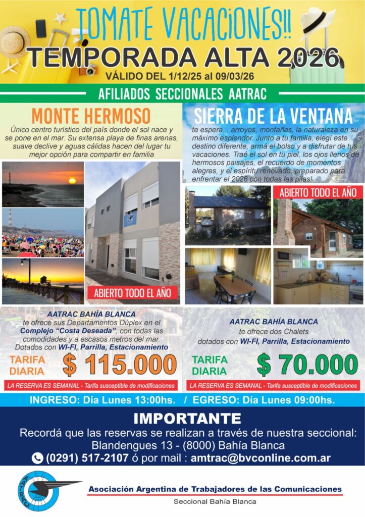 La Comisión Ejecutiva de AATRAC Bahía Blanca anuncia la actualización del tarifario de temporada alta para los complejos de Monte Hermoso y Sierra de la Ventana, ya disponible para consulta de afiliad@s.