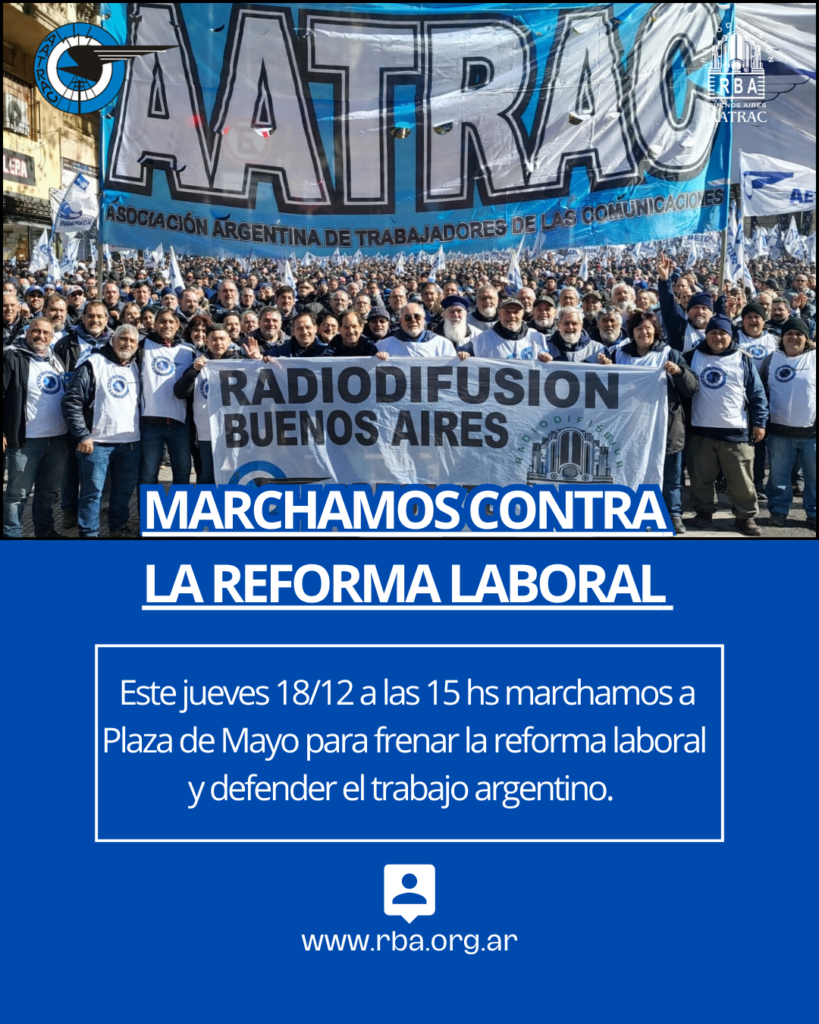Desde Radiodifusi贸n Buenos Aires, junto a AATRAC, convocamos a todas las trabajadoras y trabajadores del sector a participar de la movilizaci贸n contra la reforma laboral impulsada por el Gobierno.